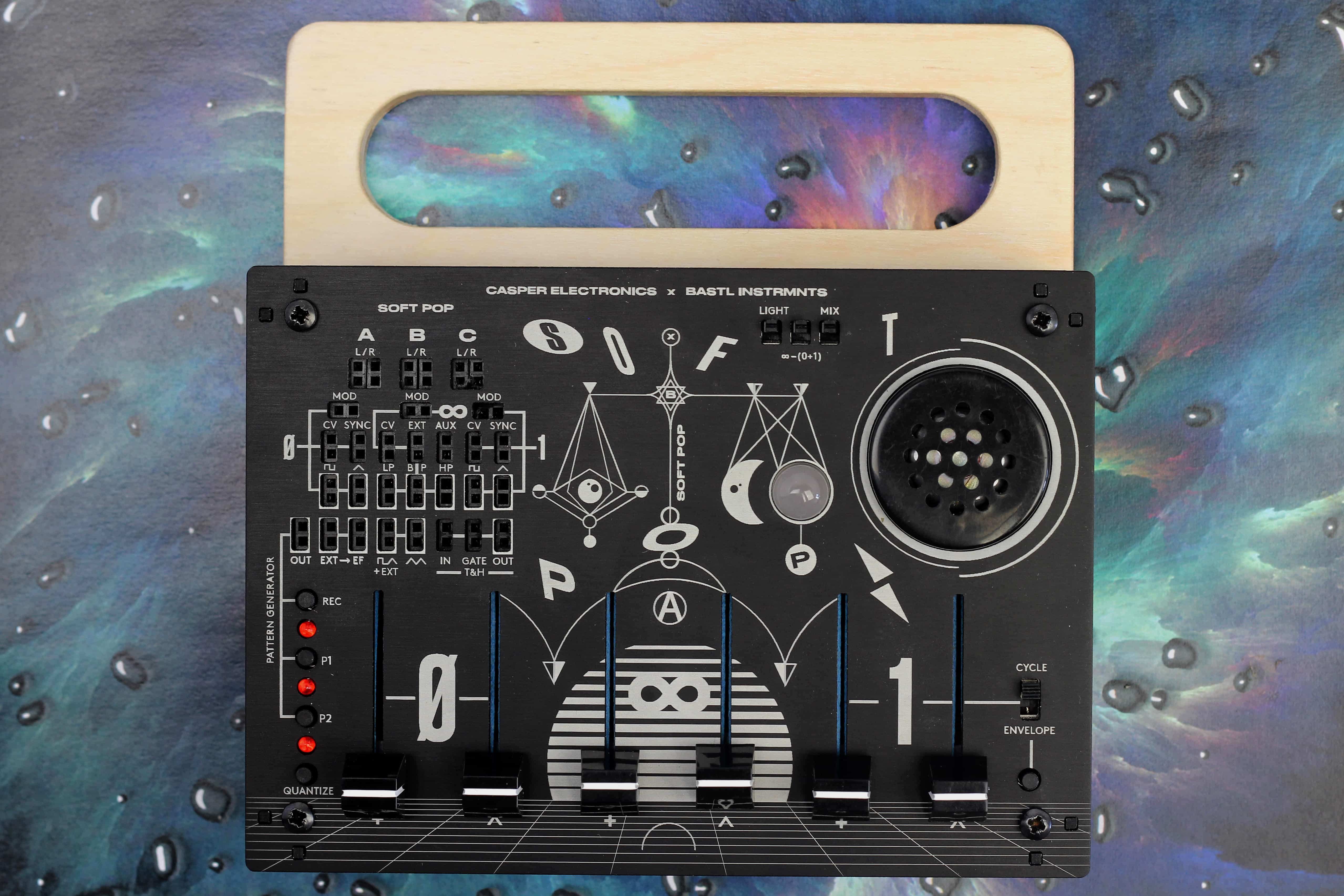 softPop is a playfully organic, semi-modular light and sound synthesizer with wide variety of sounds: from random dripping water pops to heavy subtractive basslines. Its fully analog core consisting of a heavily feedbacked system of dual triangle-core oscillators, state variable filter and sample and hold is played through an intuitive interface of 6 faders that provide countless combinations which can be explored by anyone. It can also process external audio thru the filter while using the envelope follower to intuitively synchronise to the incoming signal. Extensive mini patchbay offers lots of reconfigurability and 3 jacks A,B,C can be used to send signals in or out of the patch bay. Battery operation, built in speaker and carrying handle make it the ultimate picnic boombox! The analog soul is enhanced by a quantize feature (auto-tune) and pattern generator with two memories P1 and P2. For adventurous and courageous souls there is a secret chamber in the back for hacking & modding.