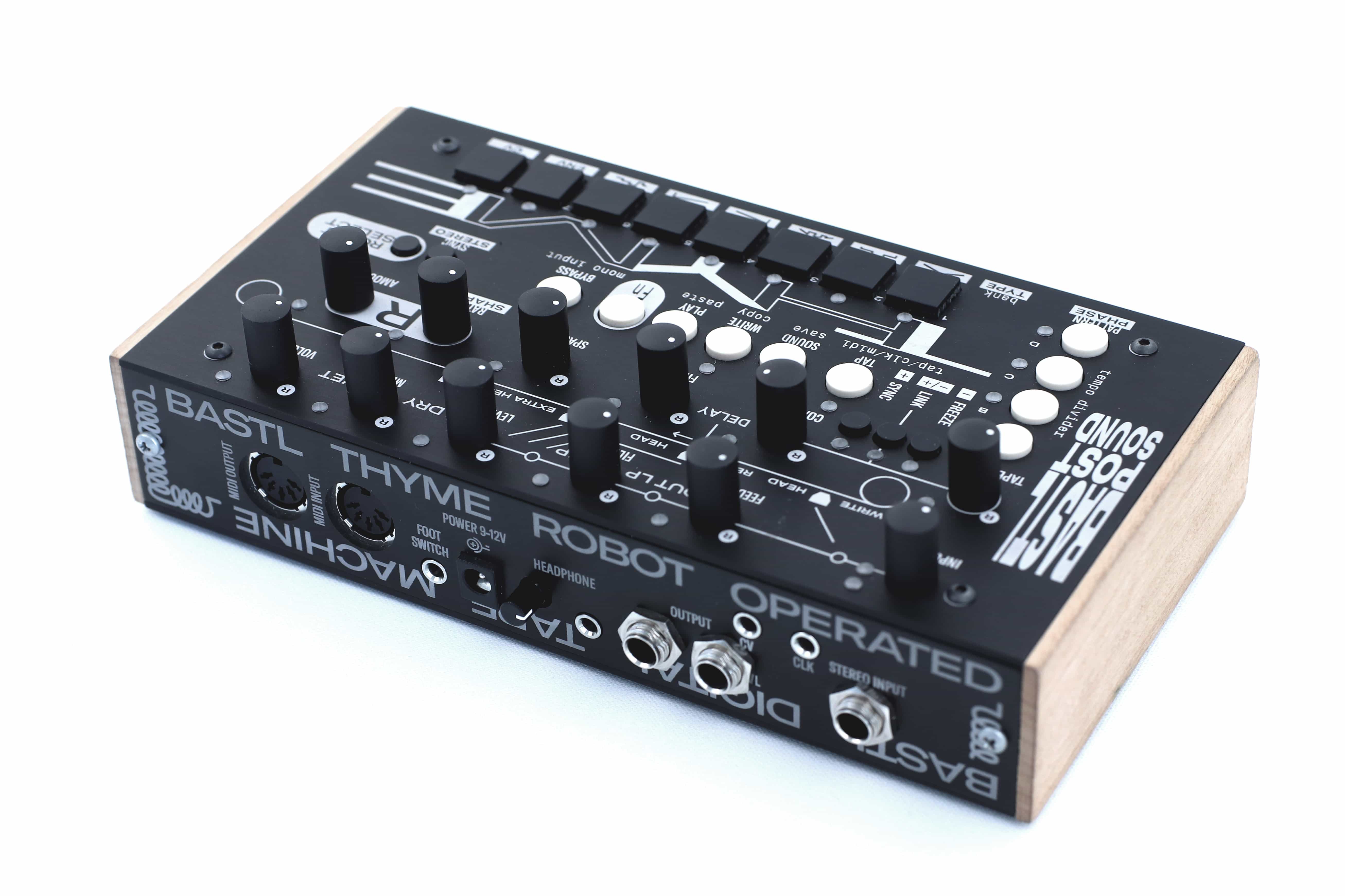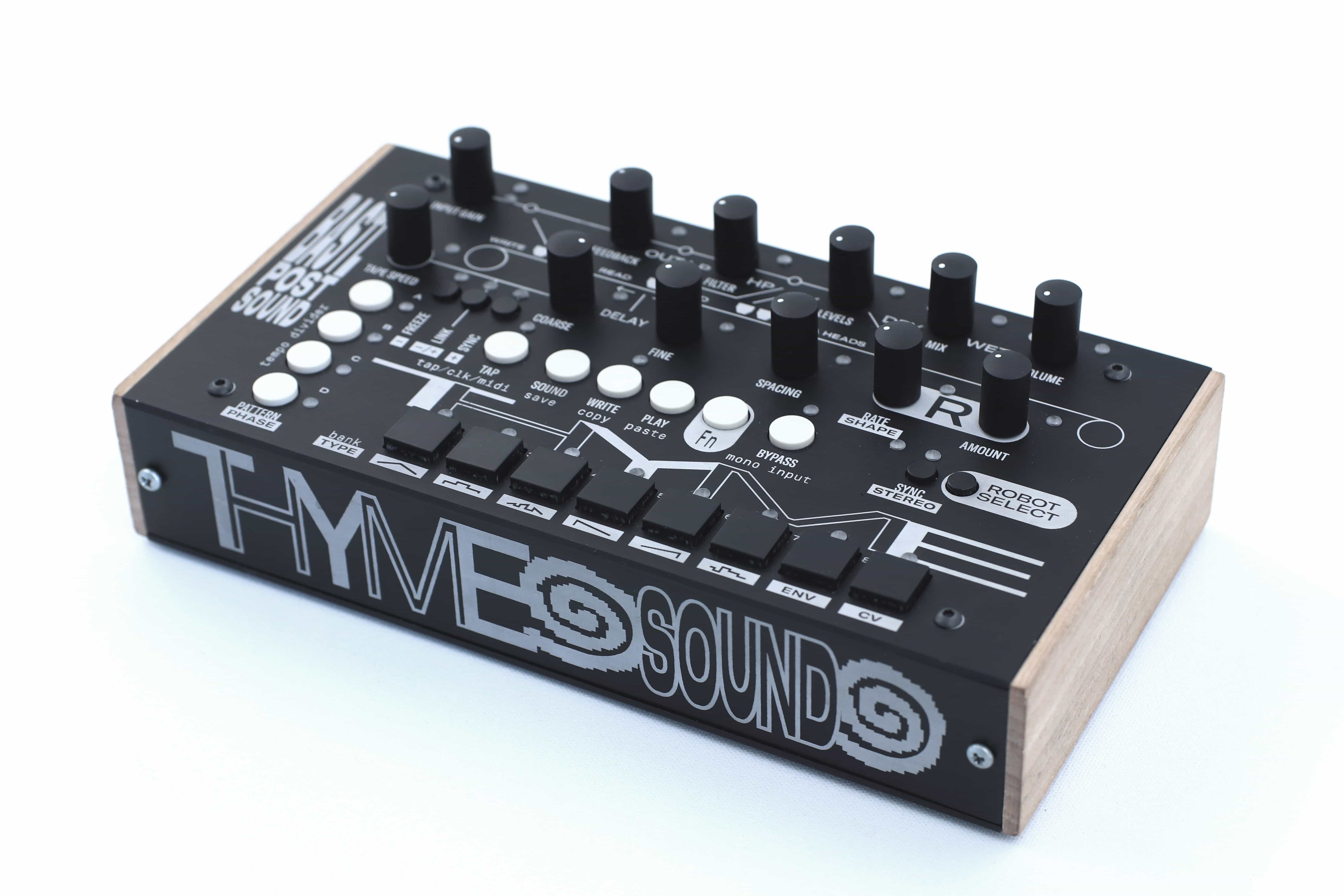 The Thyme is an effects processor that is best described as a sequenceable robot operated digital tape machine. With a lot of parameters at hand it enables the exploration of all the time based effects and the vast space in between their classical multi-effects categories (delay, phaser, reverb, chorus, pitch shifter, multi-tap delay, tape delay, tremolo, vibrato, compressor) and in stereo! Each of the 9 different parameters (Tape Speed, Delay Coarse & Fine, Feedback, Filter, extra heads Spacing and Levels, Dry Wet Mix and Volume) has a dedicated, very flexible modulation source – called the Robot – which can be phased out differently for left and right channel to create psychedelic new sound effects. The Robot can either be an LFO with many different waveshapes, external CV source or an envelope follower to enable effects reacting to dynamics. On top of everything there are 8 buttons to select a preset and those presets can be sequenced by a built in meta sequencer. The Sequencer, the Robots and the Delay can be synchronised to external or internal clock. Thyme interfaces with MIDI, analog clock and CV, it has a switchable stereo/mono input, stereo output, headphone output with level and foot switch jack.