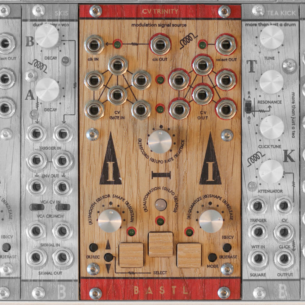 CV Trinity has 6 independent channels with CV outputs, each of which can be set to AUTOMATION, LFO or ADSR. Each channel also has a CV INPUT. The selected output [select OUT] outputs a copy of the channel that is selected for editing and lights the indication LED. Use SELECT buttons for selecting the channel and knobs for adjusting its parameters. Pressing the mode button changes between the modes. Clock OUT can be adjusted by holding select button and turning the top knob. Clk OUT is normalized to Clock IN
