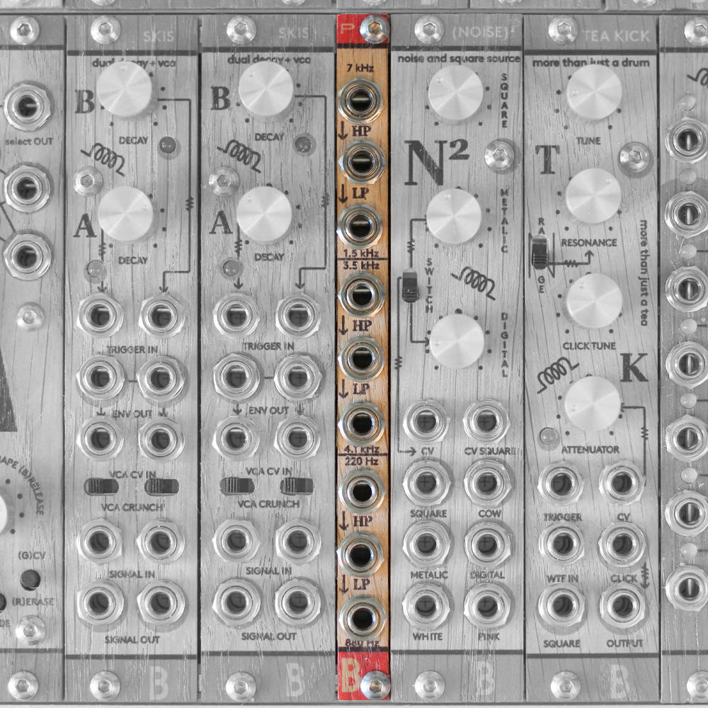 Propust is a compact tripple passive filter with with fixed cutoff frequencies for highpass and lowpass stages. It is a simple RC filter with 2 stages for HP and one stage for LP. There is a drop in signal loudness. No power connection is required. Simple fixed filters can help you to clean up your final mix and make room for each sound, or they can be used for filtering noises and other signals when generating drum sounds, for instance. When the signal goes thru both HP and LP stages, it creates BP.